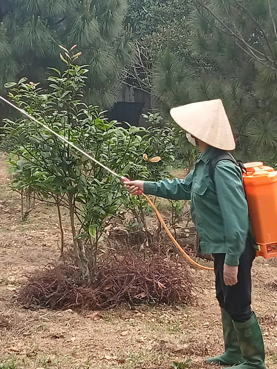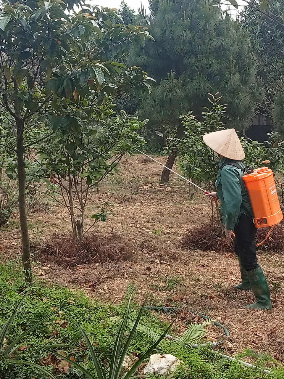 - Tiến hành phun chế phẩm sinh học trừ sâu thảo mộc kết hợp Anisaf 01, 02 và 03. Cách dùng: pha tỉ lệ 80ml mỗi loại chế phẩm pha chung với bình 20 lít nước, tiến hành pha và phun cho toàn bộ vườn. Tổng 6 bình phun.